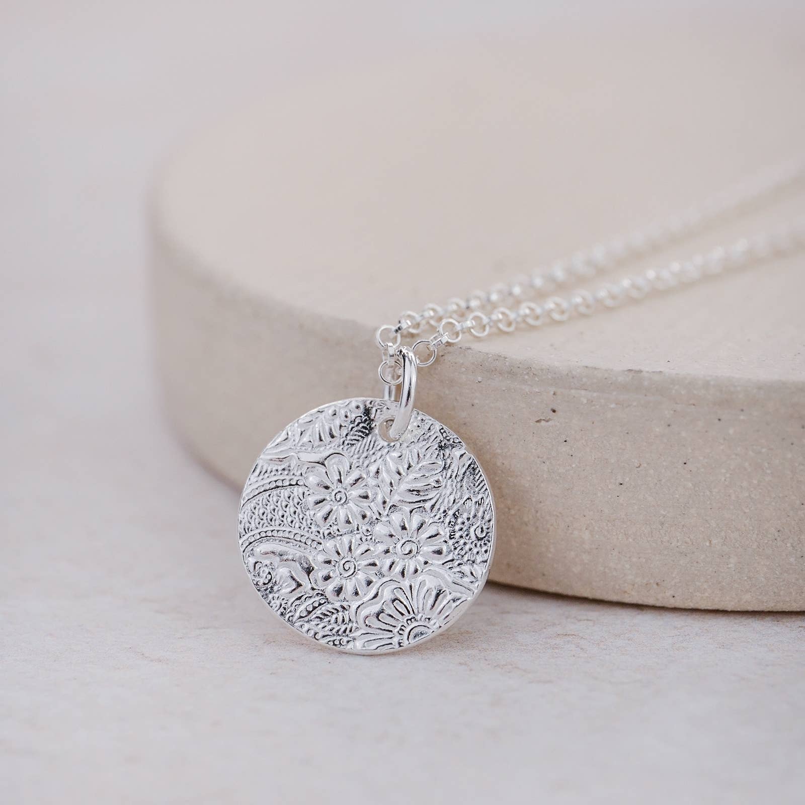 This beautifully crafted sterling silver pendant features a softly textured circular charm, created using delicate lace patterns pressed into the silver by hand. Each piece is individually made in Cornwall using recycled and eco-friendly sterling silver to offer a mindful, sustainable choice.